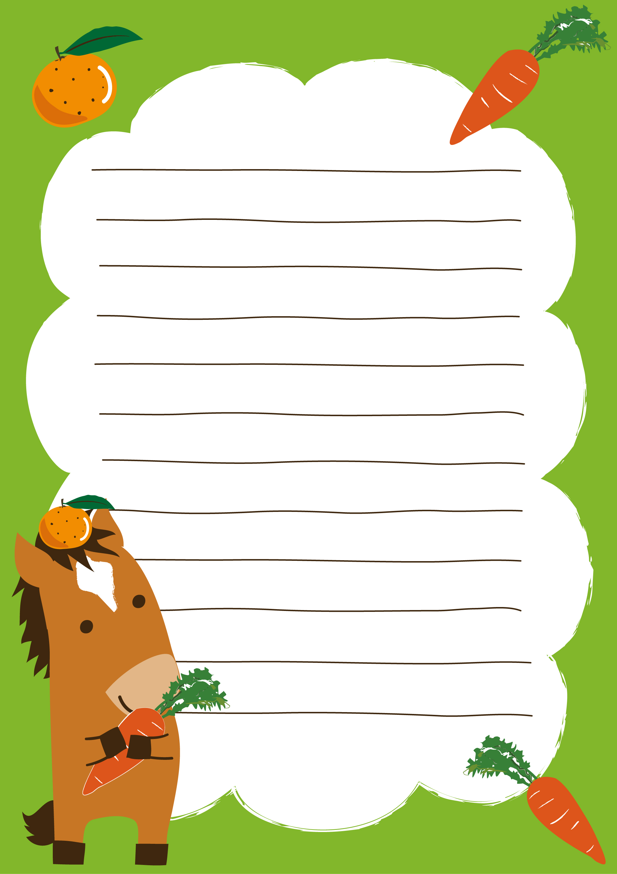 頭にミカンをのせた仔馬と人参のほんわか便箋テンプレートです